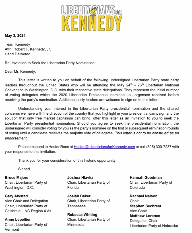 Robert F. Kennedy, Jr. will be considered for the nomination as the Libertarian Party’s presidential candidate today!