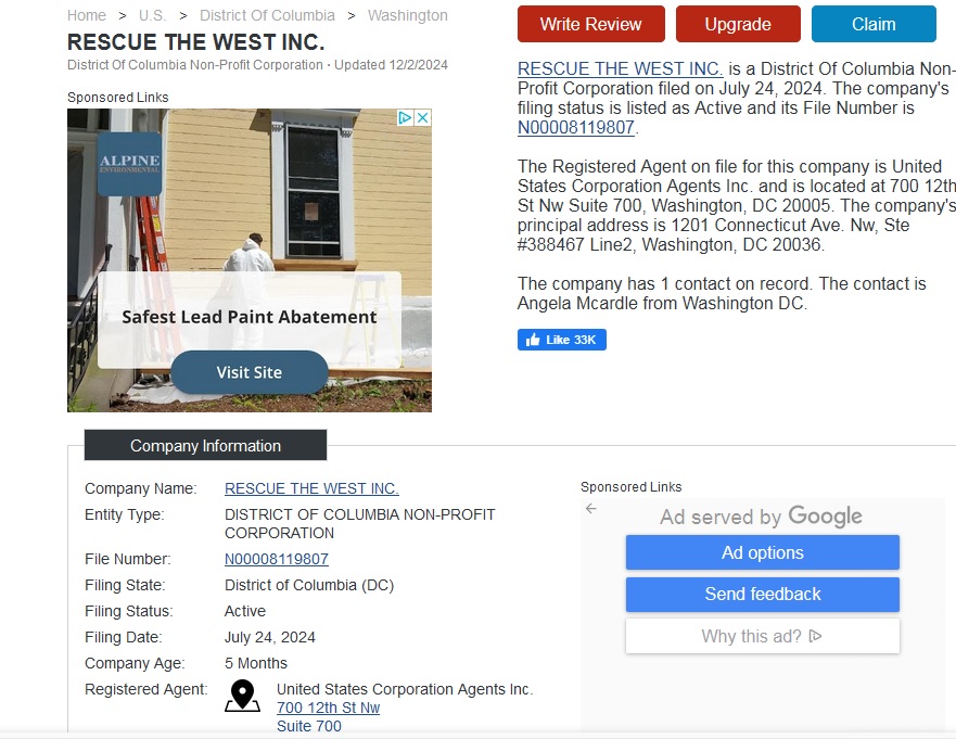 In Washington, D.C., there is a non-profit corporation “Rescue the West”. It was formed in July of this year. Courtesy of Bizapedia we can give you some information about it.