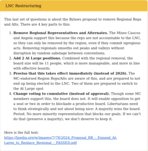 Find here a document made by the Mises Caucus for state organizers, to understand how their delegation would vote. Within it shows that the Caucus board as well as McArdle supported the removal of regional reps and was against the addition of cumulative voting in order to centralize control and power to the LNC and to not allow any opposition to have a say within the LNC. The full google form showing such can be found here (https://docs.google.com/forms/d/e/1FAIpQLSfBJAGdNVtfdKFp4CSbNpiRA-qWDb_WFxG8_Km-BFW8jV0n8Q/viewform) with the sixth page showing what the Caucus board supported in regards to bylaw amendments, reasoning that was not as apparent in their Convention Strategy Plan (https://drive.google.com/file/d/18iyWxO2lRjxodyaNz86rLM4kvF93RGvJ/view?usp=sharing) with reference to Proposal 5 of bylaw amendments.