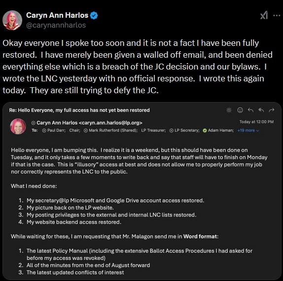 Additionally George it makes little sense since they did give me an LP email. I have no right to an LP email outside of being restored. They cannot consistently claim to be waiting and still give me an LP email address which, btw, contained all kinds of emails and information that I would not be entitled to see if I were not an LNC member. That would be gross negligence on their part.