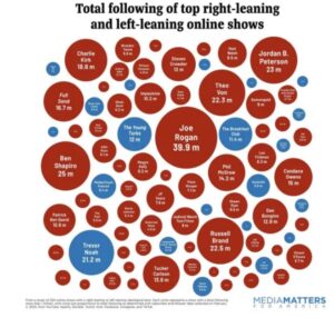 Our attention is drawn to a study by Media Matters for America of the followership of political online shows. Conservative and Republican sites had four or five times the viewership of Democratic and liberal online shows.