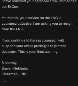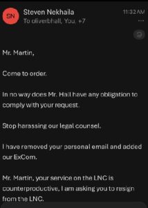 Mr. Nekhaila also called upon Mr. Martin to resign from the LNC. An extended discussion followed, involving also Mr. Chadderdon, Mr. Bohler, and Mr. Wiley.