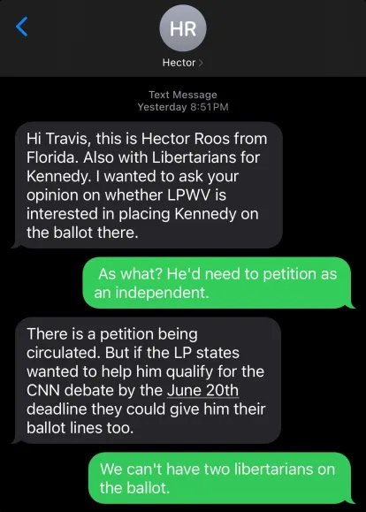 As I have explained repeatedly, there was an offer to the LNC and Oliver campaign to do a VOLUNTARY deal where sufficient states were allowed to openly place Kennedy on their ballot so the Kennedy campaign could qualify for the upcoming CNN debate with Trump and Biden. That was the context of the text message. There’s was ZERO intention as to encouraging anyone from violating party bylaws. I can forward you the complete emails to the LNC as proof. It is also preserved on the Libertarians for Kennedy website.