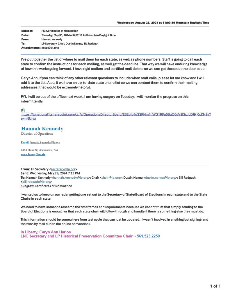 In previous Presidential elections, the national party sent certificates of nomination directly to the Secretary of State or Board of Elections. Secretary Harlos indicated that was the intention in an e-mail with the party’s Executive Director days after the national convention.
