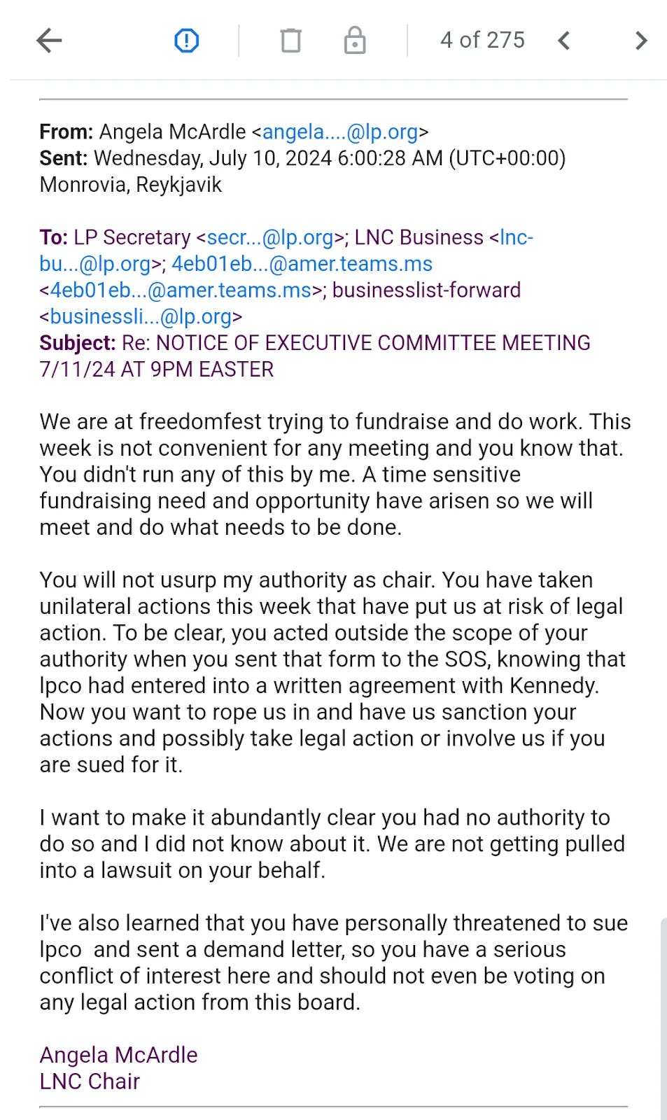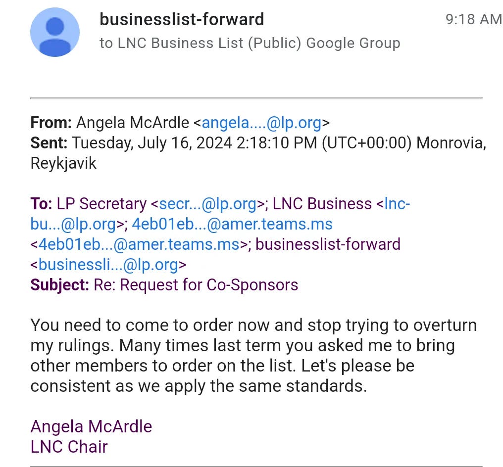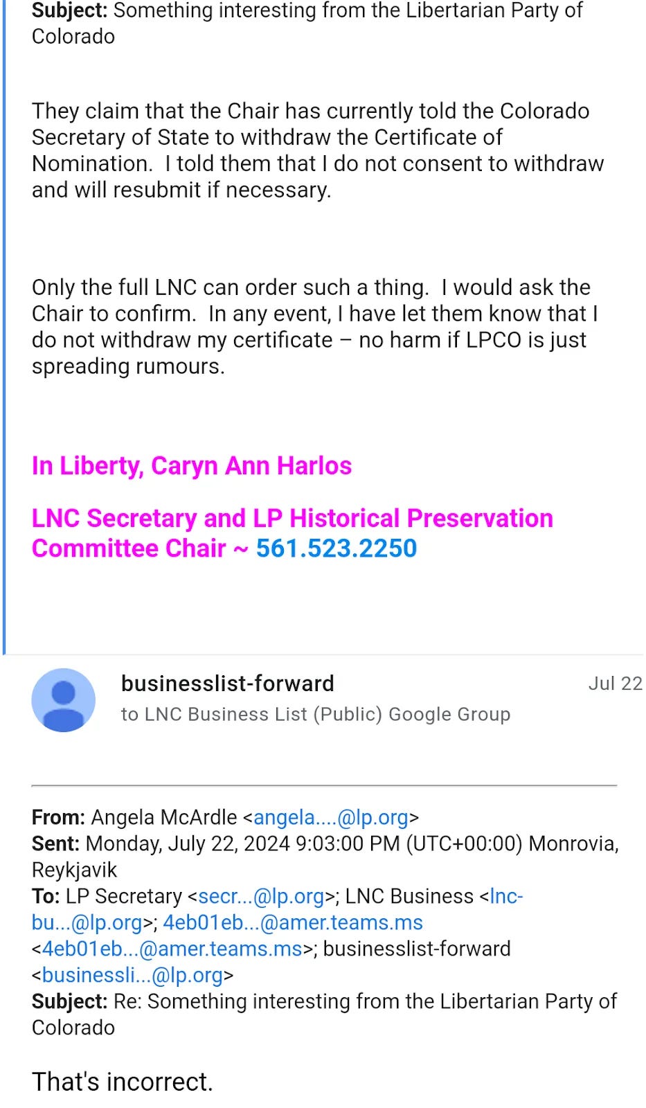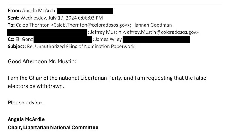 McArdle was enraged when Harlos put Libertarian Party nominee Chase Oliver on the Colorado ballot by submitting the specific Colorado nomination paperwork directly with the Colorado Secretary of State. Despite initially leading the LNC to believe otherwise, McArdle went so far as to try to remove Oliver from the Colorado ballot according to public e-mails released from the Colorado Secretary of State.